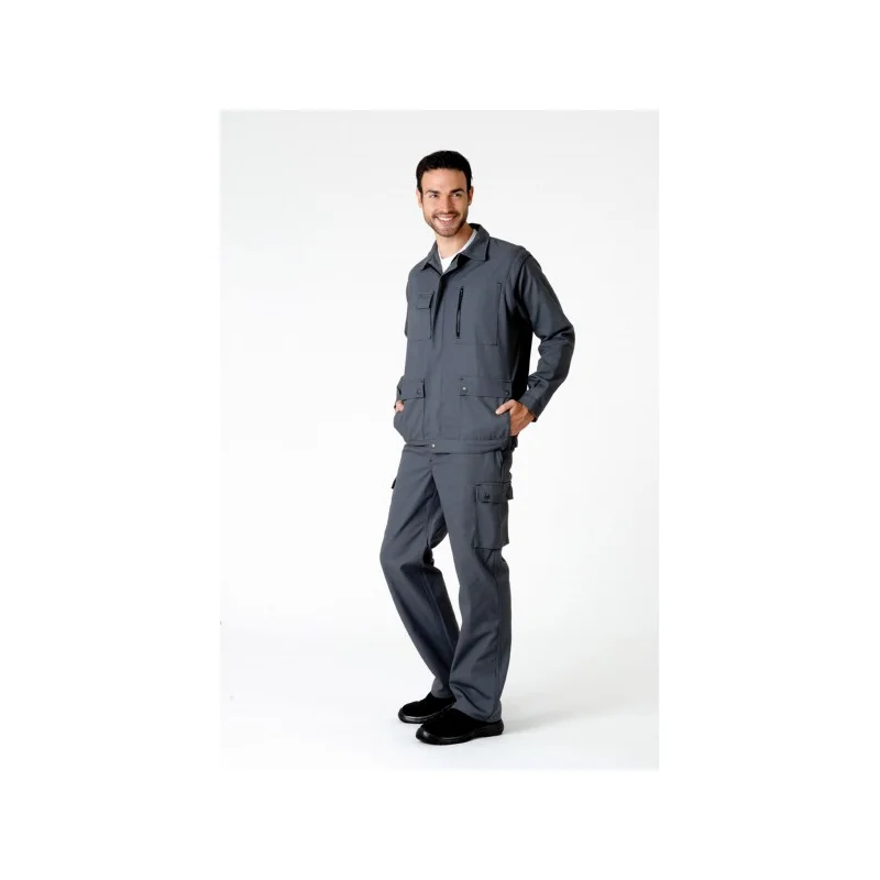 65% coton / 35% polyester - 300 g. Pinces devant, ceinture fermée par bouton célibataire, élastique côtés, 2 poches italiennes doublées, braguette boutons, 2 poches treillis à 2 soufflets fermés par rabats pressions, surpiqûres contrastées.